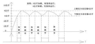 一般空壓機的啟動方式采用星三角降壓啟動后全壓運行,等降壓啟動后空壓機開始加載運行,系統(tǒng)壓力從0公斤開始上升。如果系統(tǒng)壓力上升到卸載壓力(一般為8公斤),控制器使進氣閥關(guān)閉,油氣分離器放氣,壓縮機空載運行;直到系統(tǒng)壓力低于加載壓力(一般為6公斤)下,控制器使進氣閥打開,油氣分離器放氣閥關(guān)閉,壓縮機加載循環(huán)運行。如下圖所示: