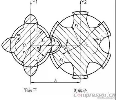 螺桿壓縮機(jī)轉(zhuǎn)子齒面主要用于壓縮氣體,由陰、陽兩根轉(zhuǎn)子的齒槽相互嚙合構(gòu)成多個(gè)工作腔。對(duì)于工藝螺桿壓縮機(jī)和干式無油螺桿壓縮機(jī),其中的陰、陽轉(zhuǎn)子工作過程中并不直接觸摸,兩轉(zhuǎn)子間的動(dòng)力傳遞是經(jīng)過同步齒輪進(jìn)行的。螺桿轉(zhuǎn)子端面齒形除滿足共軛嚙合和便于加工外,還必須具有小的泄漏三角形和較大的面積利用系數(shù)以及較高的容積效率等。所以,螺桿壓縮機(jī)的轉(zhuǎn)子型線主要由直線、擺線、圓弧、橢圓及拋物線等多段曲線首尾相切組成。螺桿壓縮機(jī)最重要的是轉(zhuǎn)子端面型線,轉(zhuǎn)子型線的好壞決定了螺桿壓縮機(jī)性能的優(yōu)劣。