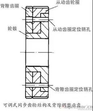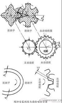 工藝螺桿壓縮機(jī)和干式無油螺桿壓縮機(jī)嚙合間隙靠同步齒輪進(jìn)行控制。同步齒輪的主動(dòng)、從動(dòng)齒輪與其對(duì)應(yīng)的為陽、陰轉(zhuǎn)子具有相同的節(jié)圓。因?yàn)橹鲃?dòng)齒輪與陽轉(zhuǎn)子是靠鍵連接的,可將它們看作一個(gè)整體齒輪。然而從動(dòng)主齒圈及背隙齒圈都套在輪轂上,當(dāng)輪轂與陰轉(zhuǎn)子通過鍵連接好后,兩齒圈相對(duì)于輪轂及陰轉(zhuǎn)子仍具有可調(diào)性。